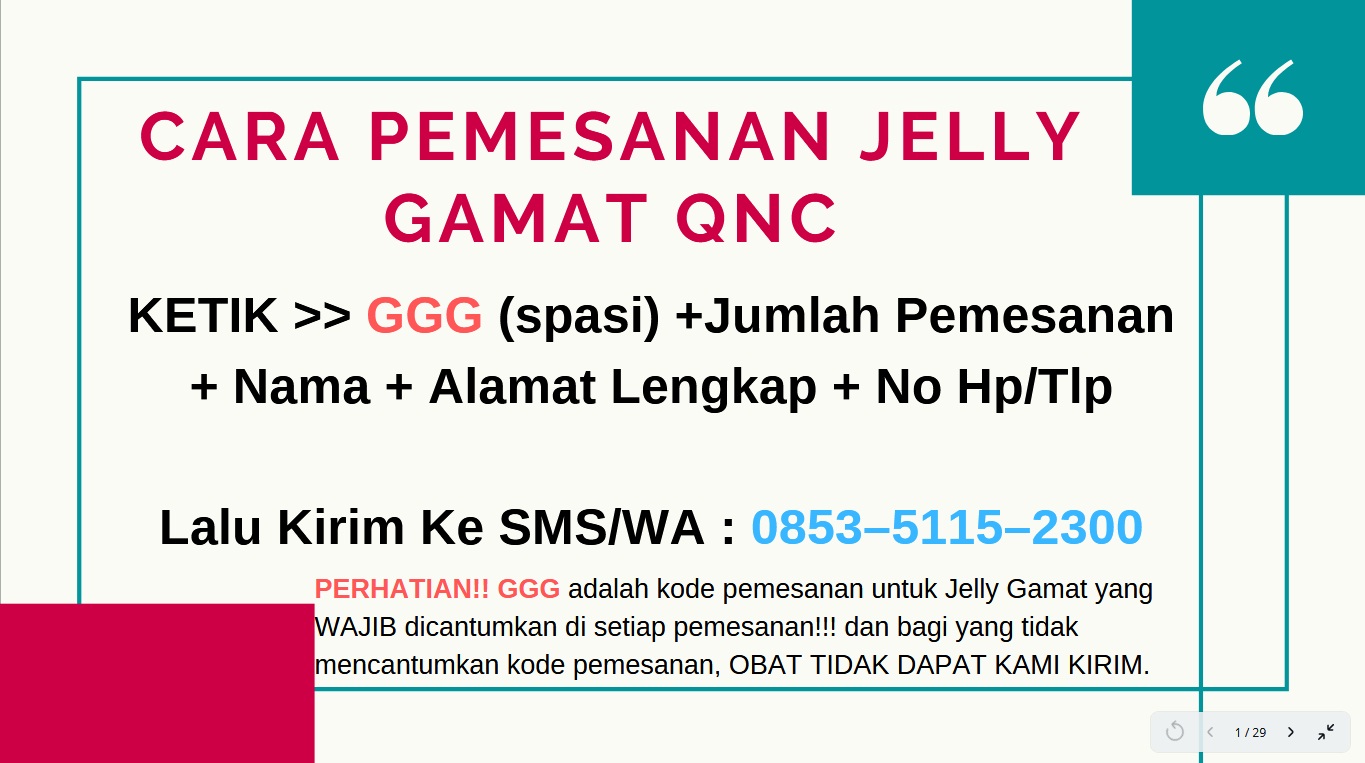 - Lakukan program pengobatan minimal 1 bulan tanpa putus untuk hasil yang maksimal. 1 bulan menghabiskan 4 Botol QnC Jelly Gamat saja.